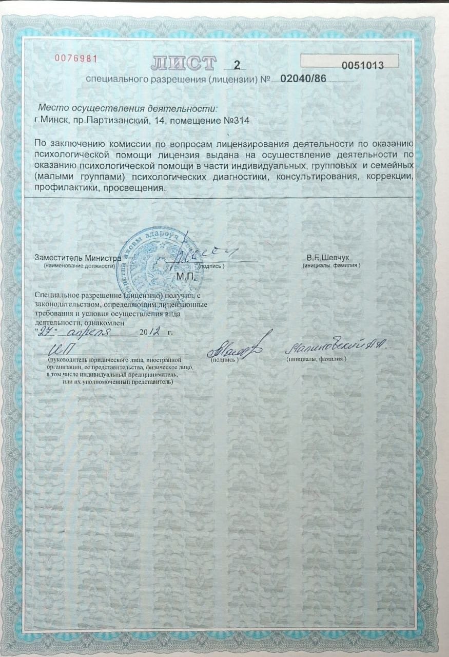 Специальное разрешение (лицензия) № 02040/86 от 29.03.2012, выдано Министерством здравоохранения Республики Беларусь.